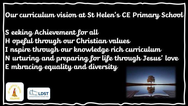 t St Helens CE Primary, we envision a future where all children shine brightly, achieving their full potential and making positive contributions to society through our high-quality, progressive curriculum and nurturing Christian values. Through our knowledge-rich approach and commitment to equality and diversity, we inspire confident, inquisitive learners who are prepared for life's challenges with love and support.