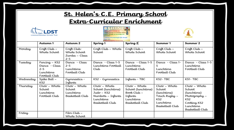 Throughout the year we aim to deliver a plan of extra-curricular activities that support our children at St Helen's to flourish and shine. Our clubs are delivered by our staff, specialist sports coaches and specialists from within our local community. Clubs are planned to give children a breadth of experiences while at our school and to try some new activities. Our choir is invited to perform within our local community and our dance club puts on termly shows for parents and will be building towards a performance at the end of the year in our local community. Our lunchtime clubs give children the opportunity to take part in intra school competitions and tournaments. Staff deliver a range of clubs from cooking, photography and craft to zumba and film club. We aim to ensure there is a balance of clubs available for all children to access.